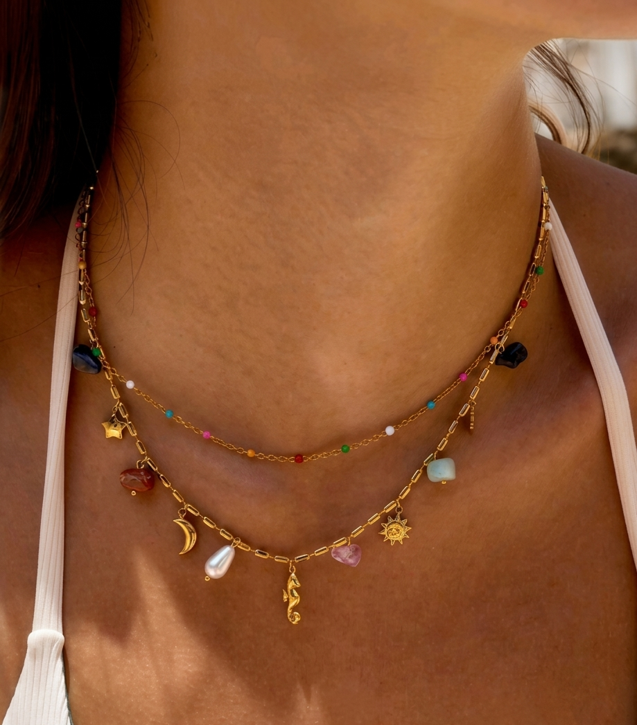 Conjunto com 2 colares em aço inoxidável. É uma peça vibrante e lúdica, ideal para quem gosta de acessórios que contam uma história e trazem cor para o dia a dia.