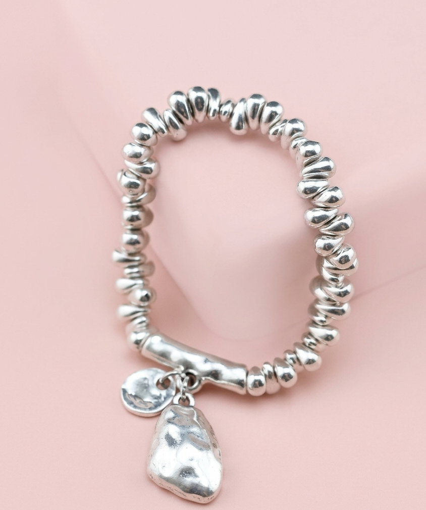 Pulseira elástica em liga de zinco. Apresenta um cristal lapidado em tom grafite escuro (estilo hematita), envolto por uma moldura de metal que segue linhas orgânicas e imperfeitas.